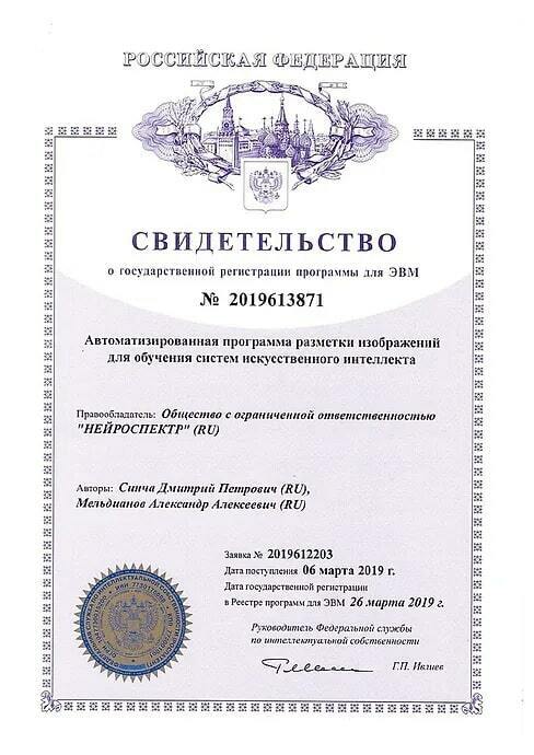 26 марта сотрудники компании «Нейроспектр» получили свидетельство о государственной регистрации программы для ЭВМ «Разработка специальных самообучающихся алгоритмов и программного продукта, автоматизирующего разметку больших массивов изображений для обучения систем искусственного интеллекта».
